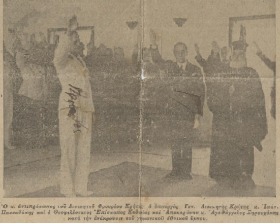 Εικ. 2. Φωτογραφία από τη δεξίωση στην έδρα της Γερμανικής Στρατιωτικής Διοίκησης, όπου εικονίζονται ο γενικός διοικητής Ιωάννης Πασσαδάκης και ο επίσκοπος Κυδωνίας και Αποκορώνου Αγαθάγγελος να χαιρετούν ναζιστικά (Πηγή: Παρατηρητής, 16 Ιανουαρίου 1944).