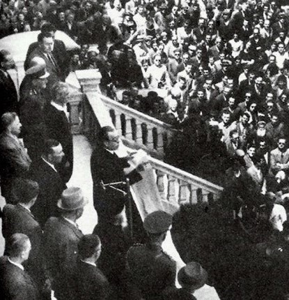 Εικ. 3. Ο υπουργός-γενικός διοικητής Κρήτης Ιωάννης Πασσαδάκης μιλάει στο συγκεντρωμένο πλήθος στην πλατεία Δικαστηρίων των Χανίων, 6 Μαΐου 1944 (Πηγή: Αρχείο εφημερίδας Πατρίς).