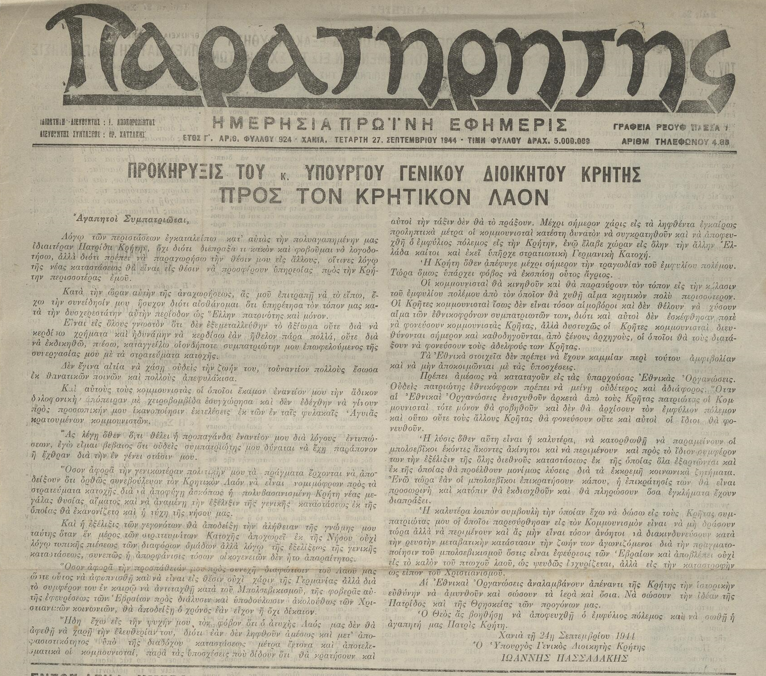 Εικ. 4. Η τελευταία προκήρυξη του υπουργού-γενικού διοικητή Κρήτης Ιωάννη Πασσαδάκη προς τον κρητικό λαό (Παρατηρητής, 27 Σεπτεμβρίου 1944).