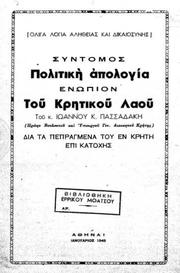 Εικ. 5. Το εξώφυλλο της Απολογίας του Ιωάννη Πασσαδάκη, η οποία εκδόθηκε το 1948 με τη βοήθεια υποστηρικτών του, ενώ ο ίδιος βρισκόταν στη φυλακή.
